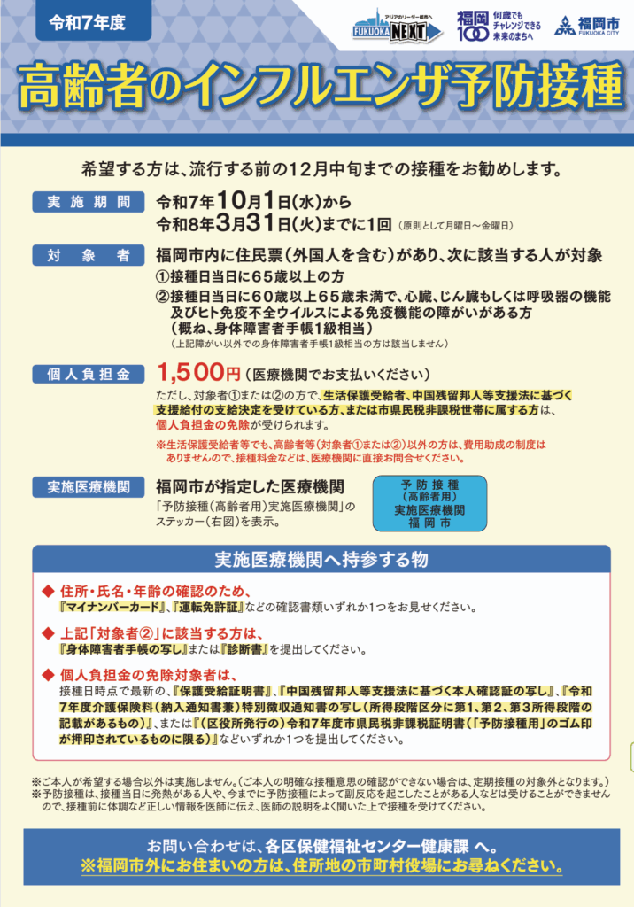 ワクチンの効果が出るまで1~2週間程度かかります。流行が本格化する前の接種が有効です。 65歳以上などの対象者には福岡市の助成制度(自己負担1,500円・免除要件あり)があり、市のページで詳細をご確認ください。